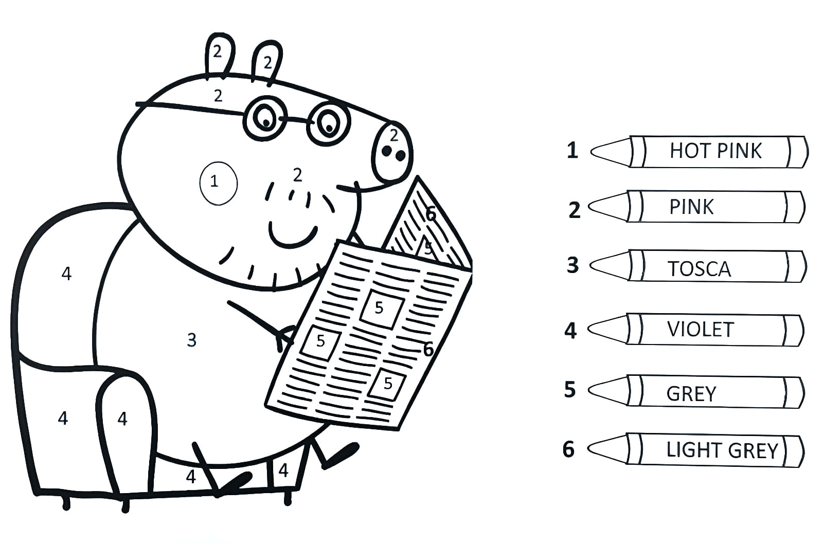 MundoColorir oferece Colorir por Número com o Papai Pig do desenho Peppa Pig em JPEG com resolução de 1602 × 1058 (aprox. 366.64 KB). Sinta-se à vontade para baixar e imprimir, ou colorir online diretamente nesta página. É totalmente grátis e fácil.